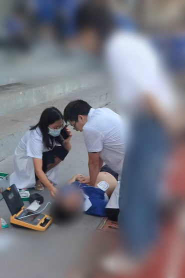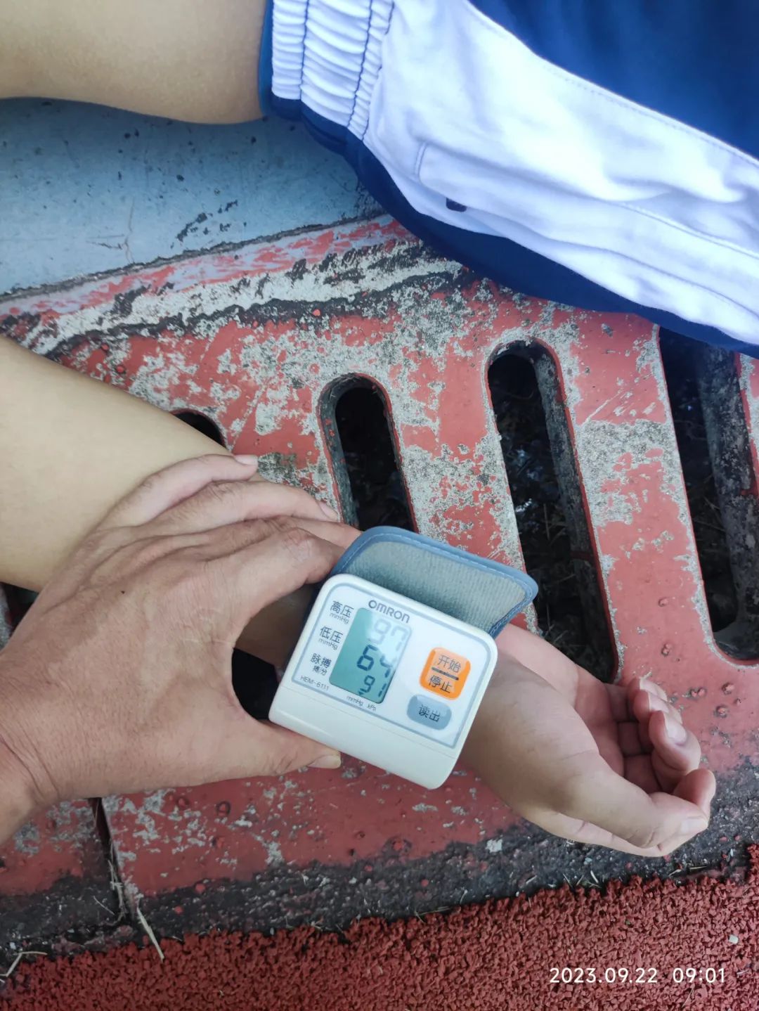 2023年9月22日,龙岗区横岗街道某中学,大课间跑操近尾声时,一名高一男生突然倒地。为避免踩踏,老师立即组织学生绕开、不围观,并呼叫校医。校医室距事发地仅20余米,校医余岩和王雨虹闻声后,带着急救箱一分钟左右赶到现场。8:51,王雨虹医生拨打120急救电话,与此同时,余岩医生检查发现该男生叹气样呼吸,拍肩呼之不应,无呼吸、无脉搏,立即开始胸外按压,并请旁边的老师去医务室外墙取AED。8:56,AED送到,余岩医生立即开机,随后按照AED提示音完成一次电击除颤,并在AED的提示下继续做心肺复苏。8:59,倒地男生心跳、呼吸恢复,并有一点意识。9:01,该名男生神志恢复,并睁眼说自己没事了,此时测量血压 、心率正常,现场急救成功!9:03,龙岗区第三人民医院120救护车到达操场,将该男生转送至医院接受进一步治疗。