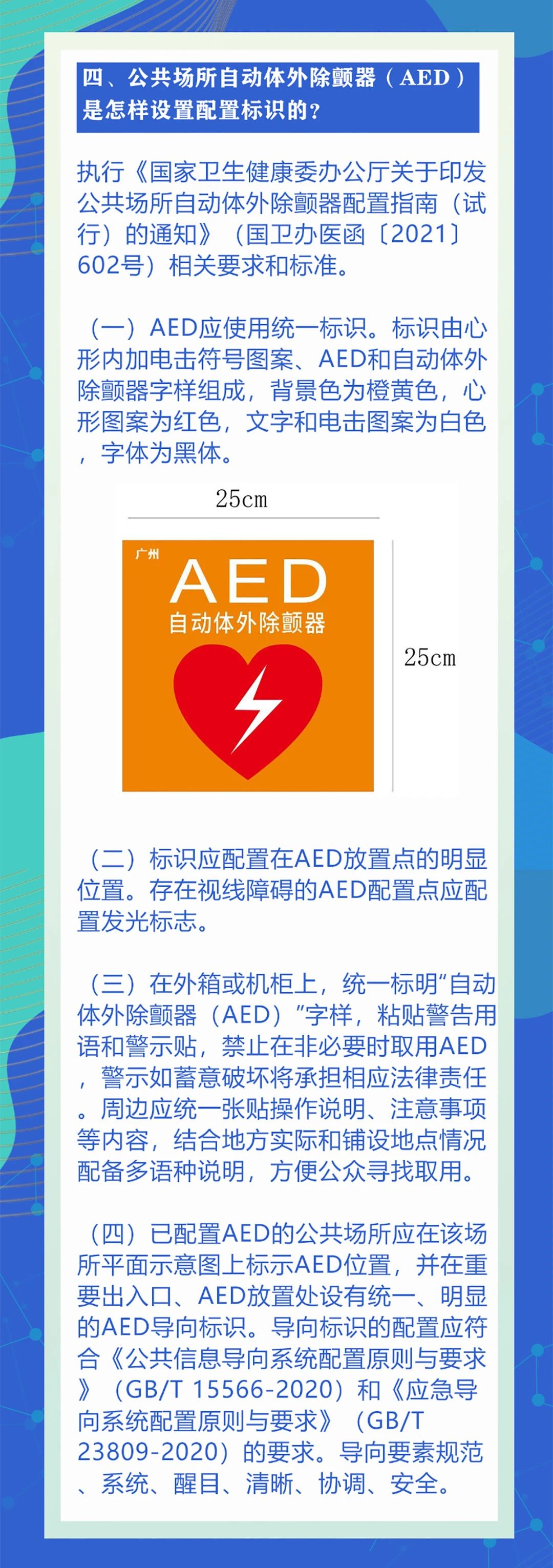 (四)已配置AED的公共场所应在该场所平面示意图上标示AED位置,并在重要出入口、AED放置处设有统一、明显的AED导向标识。导向标识的配置应符合《公共信息导向系统配置原则与要求》(GB/T 15566-2020)和《应急导向系统配置原则与要求》(GB/T 23809-2020)的要求。导向要素规范、系统、醒目、清晰、协调、安全。